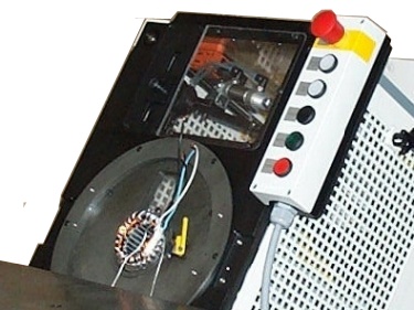 Die Bandagiermaschine SM10 bandagiert Statoren von liØ 23 bis IEC100. Die Indexierung des Stators erfolgt mittels eines Servomotors und einer Siemens S7 Steuerung. Ein übersichtliches Display erlaubt eine Stich- und Geschwindigkeitsprogrammierung.